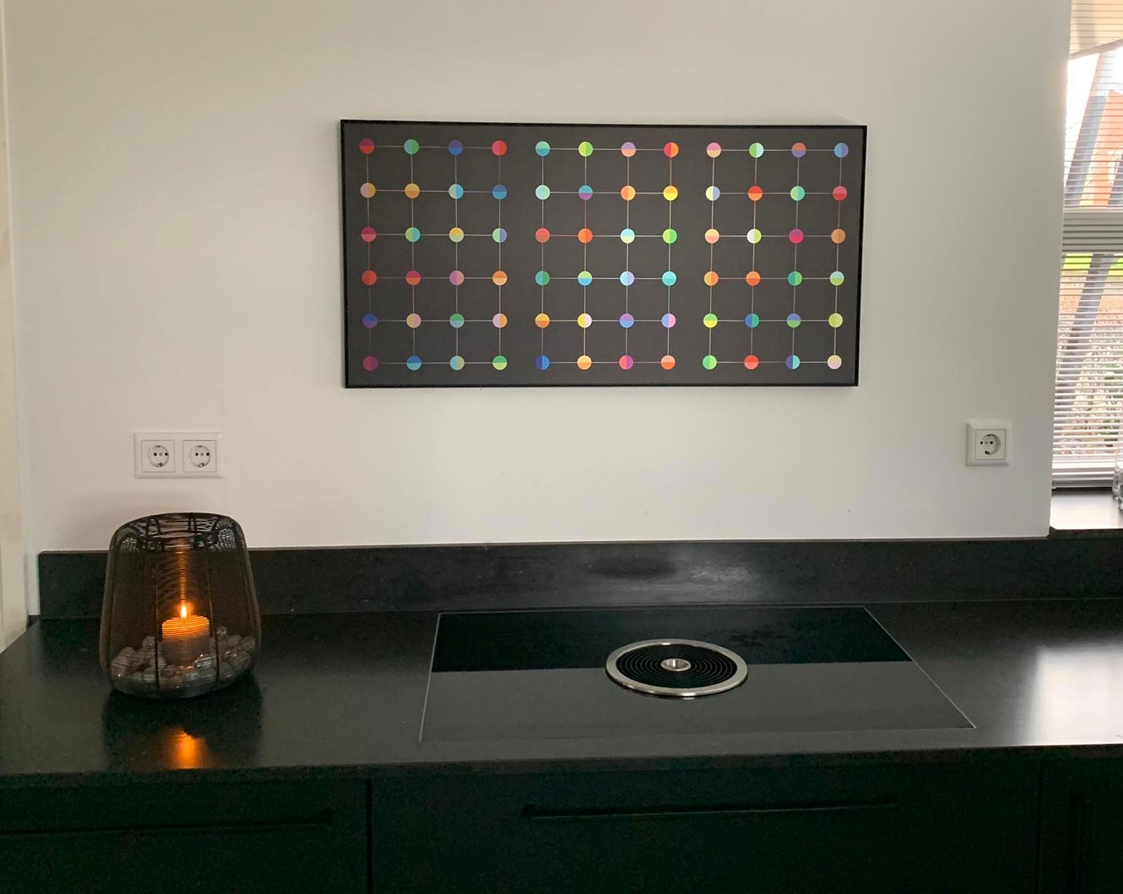 Dots & Gradients #2 – A grid of dots connected by lines. Dimensions – 45 cm high, 90 cm wide This art work has been printed on aluminum with butlerfinish with life long colour guarantee. Our private gallery in Amsterdam We are a small private gallery in the charming center of Amsterdam. Most of the […]